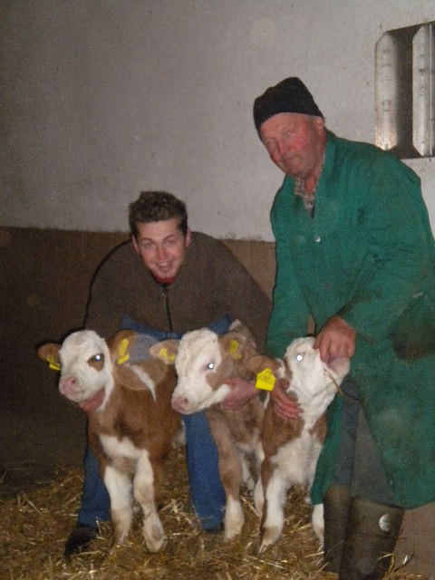| „Da hat er ganz schön geschaut, da Pöll Franz“ als am Kathreinstag die Kuh Namens Fiesta Drillinge zur Welt brachte. Mit Zwillingen hat man gerechnet, aber dass es gleich drei Kälber wurden und noch dazu mit beträchtlichem Geburtsgewicht verblüffte sogar den routinierten Stallmeister Franz. Auch Thomas sowie die ganze Familie Pöll freut sich über dieses seltene Ereignis. Wir wünschen alles Gute! Foto: Anneliese Hutterer |