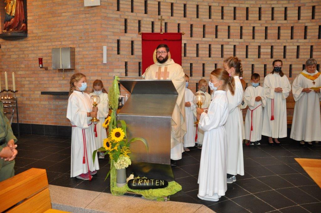 P. Jakobus rief in seiner Erntedankpredigt dazu auf, sich bewusst mit Lebens- und Nahrungsmitteln auseinanderzusetzen, denn nichts ist selbstverständlich! Die Pfarre mit P. Jakobus und Pastoralassistentin Ingrid Verres an der Spitze nutzten diesen festlichen Anlass, um die vielen neuen Ministrantinnen und Ministranten nun offiziell der Pfarre vorzustellen und sie aufzunehmen. Auch wir wünschen den vielen Kids viel Freude bei der Ausübung ihrer neuen Aufgabe.