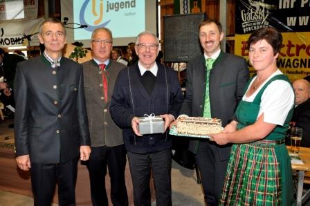 Im Anschluss dankte das Ortsoberhaupt unserem Herrn Pfarrer ausführlich für seine Bautätigkeit, seine Seelsorge und sein aktives Mitwirken in der Dorfgemeinschaft. Mit den Worten "Wir sind froh und stolz Sie in unserer Mitte zu haben" brachte er auch seine Hoffnung zum Ausdruck, Pater Burkhard noch lange als Pfarrer in Kirchham haben zu dürfen. Als Geschenk von Pfarre und Gemeinde wurde dem Jubilar eine Armbanduhr mit dem Gemeindewappen sowie die legendären Konsistorialratsschnitten überreicht.