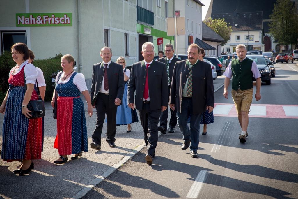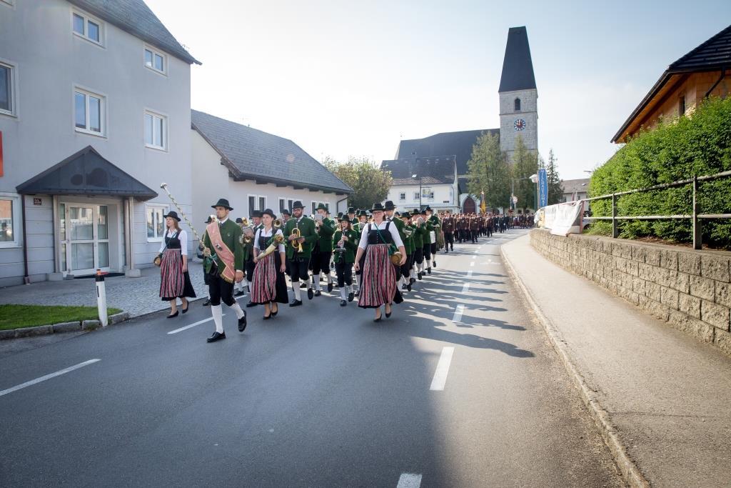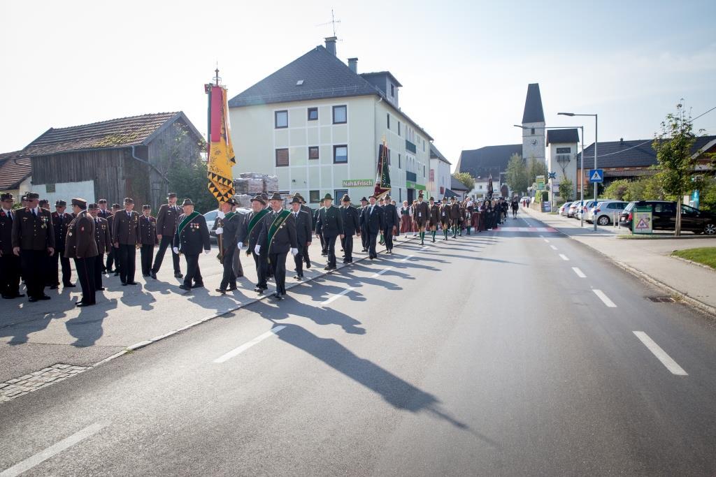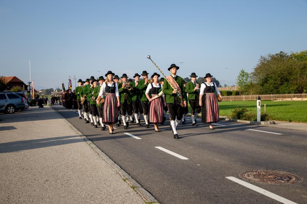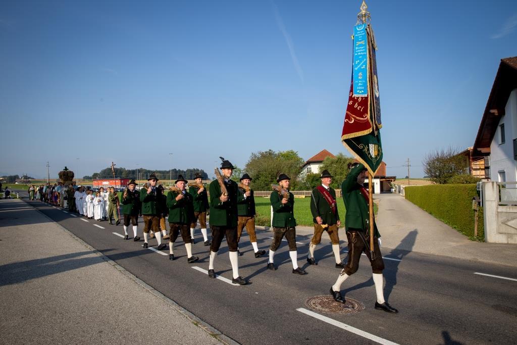 Nach der Segnung dieser durch Pfarrer P. Burkhard wurde diese durch 4 Burschen der Landjugend in einem Festzug, angeführt von der Musikkapelle, in die von der Ortsbauernschaft festlich geschmückten Pfarrkirche getragen.