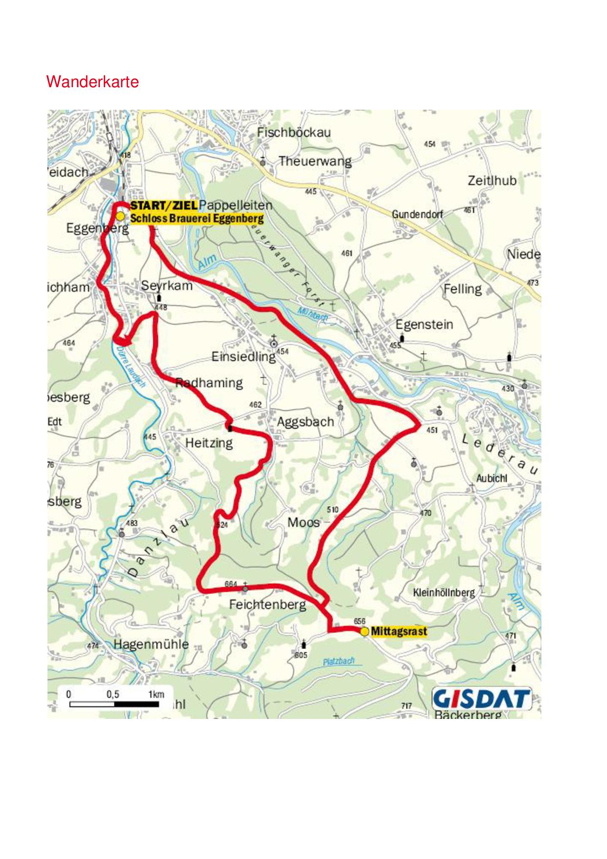 Von nun an geht’s bergab  – mit dem Ziel, die Schloss Brauerei Eggenberg vor Augen marschieren wir auf Wald – und Wiesenwegen bis in die Ortschaft Aggsbach. Von hier aus  führen uns Feldwege durch die Ortschaften Heitzing, Radhaming und Seyrkam zur letzten Rast mit Köstlichkeiten der heimischen Bauern. Entlang der Laudach führt uns ein romantischer Weg in die Ortschaft Eichham. Hier öffnet das  Traktormuseum  „ Sadleder “ seine Tore, wo 30 liebevoll restaurierte Traktoren und nostalgische  Motorräder bewundert werden können. Und dann haben wir unseren Ausgangspunkt nach  17,5 Km, die Schloss Brauerei Eggenberg, erreicht