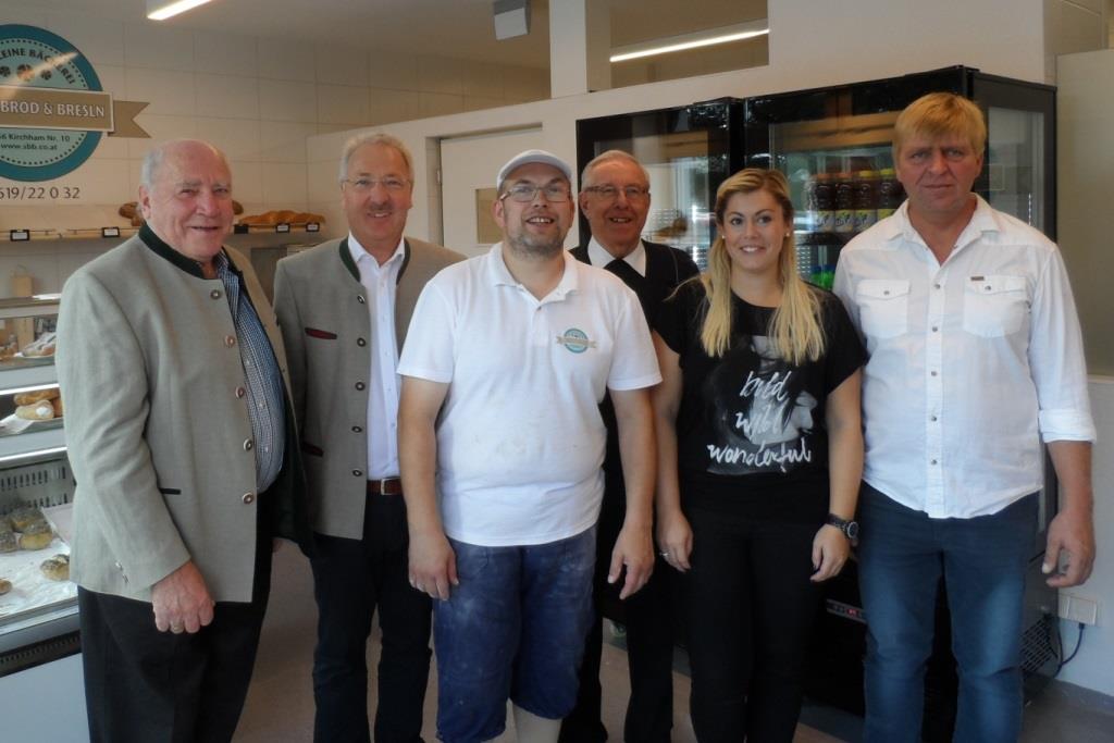 Foto (Gemeinde Kirchham): Strahlende Gesichter bei der Eröffnung des Kirchhamer Gewerbehauses v.l.n.r.: Hausherr Anton Starzinger, Bürgermeister Hans Kronberger, Bäckermeister Norbert Neuwirth, Pfarrer P. Burkhard Berger, "Style-Werkstatt"-Chefin Isabella Weber und Thomas Amering.