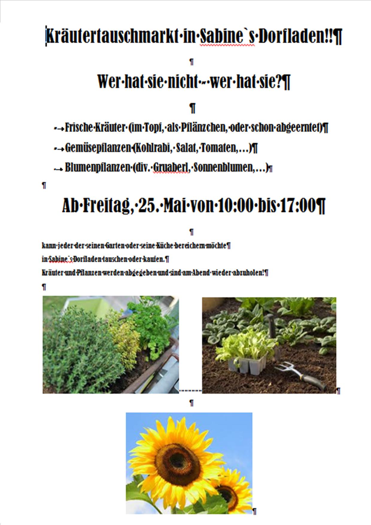 Unter diesem Motto können jeden Freitag frische Kräuter, Gemüsepflanzen oder Blumenpflanzen in Sabines Dorfladen gekauft oder getauscht werden. Dazu werden die Pflanzen ab 10.00 Uhr in Sabines Dorfladen gebracht und am Abend wieder abgeholt. Nähere Informationen bei Sabine Lehmann oder Manuela Brunnthaller-Moser. |