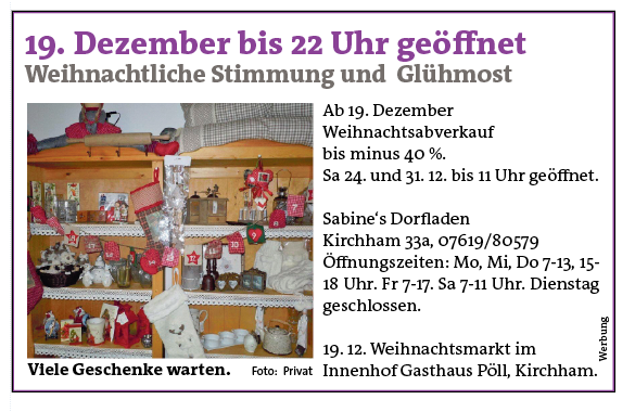 Sabines Dorfladen hat am 19. Dezember sogar bis 22 Uhr geöffnet. Nutzen sie die Gelegenheit für die letzen Weihnachtsgeschenke bei vorweihnachtlicher Stimmung.