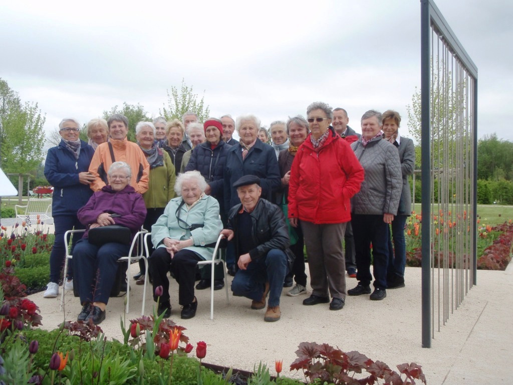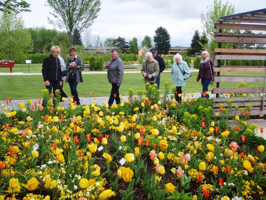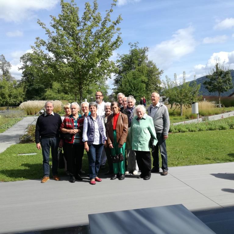 26 Teilnehmer, auf 2 Gruppen geteilt, bei der Führung durch die Geriatrie.   Hier im "Terapiegarten".
