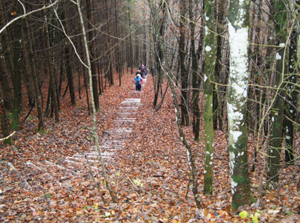 Die Teilnehmer waten durch einen dicken Laubteppich zügig bergwärts.