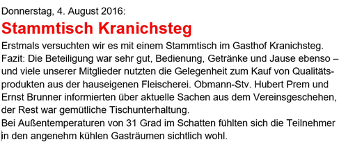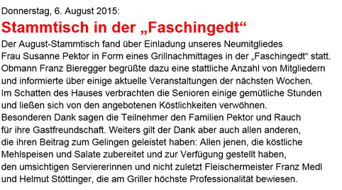 In gewohnter, gastfreundlicher Art u. Weise wurden die Mitglieder empfangen und bewirtet. Der Hausherr Anton Starzinger fungierte als Grillmeister zur besten Zufriedenheit. Von den Mitgliedern Helmut Zwicker, Franz Vichtbauer und Helmut Bittendorfer wurden einige Lieder angestimmt, welche zur geselligen Unterhaltung wesentlich beigetrugen.