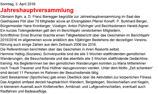 Obm. Bgm. a. D. Franz Bieregger konnte auch heuer wieder zahlreiche Ehrengäste, wie Kons. R.P. Burkhard Berger, Bgm. Joh. Kronberger, Vz. Bgm. Ing. Ingo Dörflinger, Ortsbauernobm. Anton Pühringer und das Sängerinnen Quartett „Singa is insa Freud`“ recht herzlich begrüßen. Auch SB. Bezirksobm. Harald Aigner war kurz anwesend.
