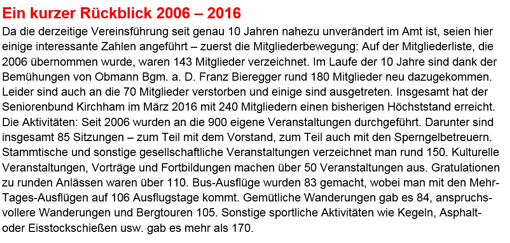 In den Ansprachen betonten die Redner die Wichtigkeit des Seniorenbundes für das gesellschaftliche und kulturelle Leben in einer Gemeinde. Auch die Bedeutung der Senioren als Wirtschaftsfaktor kam zur Sprache. Die starke Zunahme der Senioren in den nächsten Jahrzehnten wird eine Herausforderung für die Gesellschaft und Politik.