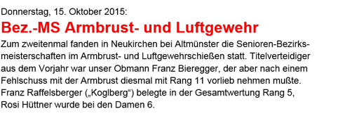 Die Bezirksmeisterschaft im Armbrust- u. Luftgewehrschießen in Neukirchen/Altmünster am 11.10. war für die 4 TN unserer Ortsgruppe ein voller Erfolg.