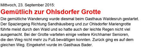 Bei wunderschönem Wetter wanderten 12 Senioren vom Parkplatz beim Gemeindeamt entlang des Kapellenweges. Vor dem Bannholz genossen wir den prächtigen Herbstwald. Durch den schattigen Wald ging es nach einer kurzen Pause weiter bis zu einem blühenden Sonnenblumenfeld. Über den Sonnenweg wanderten wir zurück nach Kirchham. Abschluss dieses schönen Nachmittags war im Gasthaus Bauer.