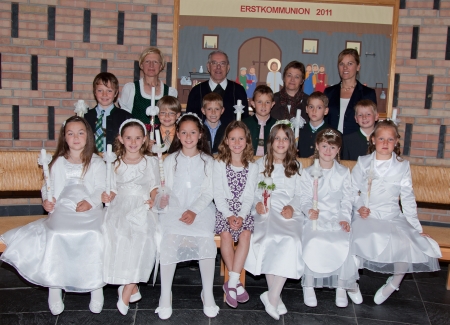 Am Christi Himmelfahrtstag durften 11 Kinder (6 Mädchen und 5 Knaben) gemeinsam mit der Pfarrbevölkerung das Fest der Hl. Erstkommunion feiern. Das Symbol „Wagenrad“ – JESUS, UNSERE MITTE war heuer das Thema des besonders schön gestalteten Gottesdienstes. Religionslehrerin Frau Maria Buchegger und die Tischmütter haben die Kinder besonders gut auf diesen Festtag vorbereitet. Im Anschluss an die Festmesse ging es dann ins Pfarrheim wo die KFB die Kinder mit ihren Tischmüttern zu einer Stärkung einlud. Als kleine Erinnerung gab es von der KFB liebevoll verzierte Kerzen für jedes Kind. Den Abschluss dieses besonderen Tages bildete für die Erstkommunikanten die Prozession zur Leithinger Kapelle. Begleitet wurden sie von der Musikkapelle. Pfarrer P. Burkhard segnete dort die Erstkommunionkinder und überreichte ihnen ein bemaltes Kreuz aus El Salvator als Pfarrgeschenk.