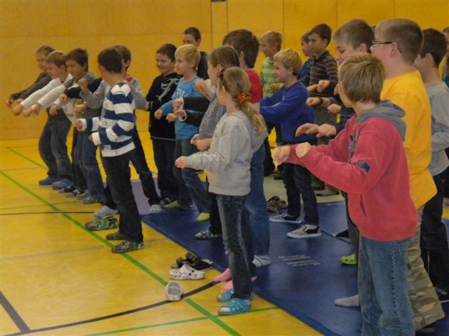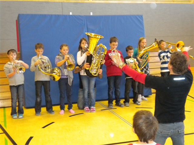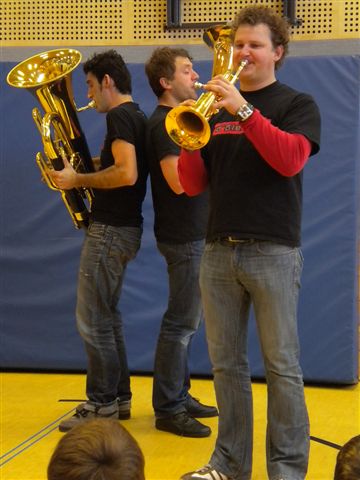 In einer bühnenreifen Show wurden Tuba, Waldhorn, Flügelhorn und Trompete erklärt. Wildschweine wurden erlegt, Liebeserklärungen verfasst, mit dem Moped gefahren und Schwertkämpfe ausgefochten …. – alles dargestellt von Instrumenten.