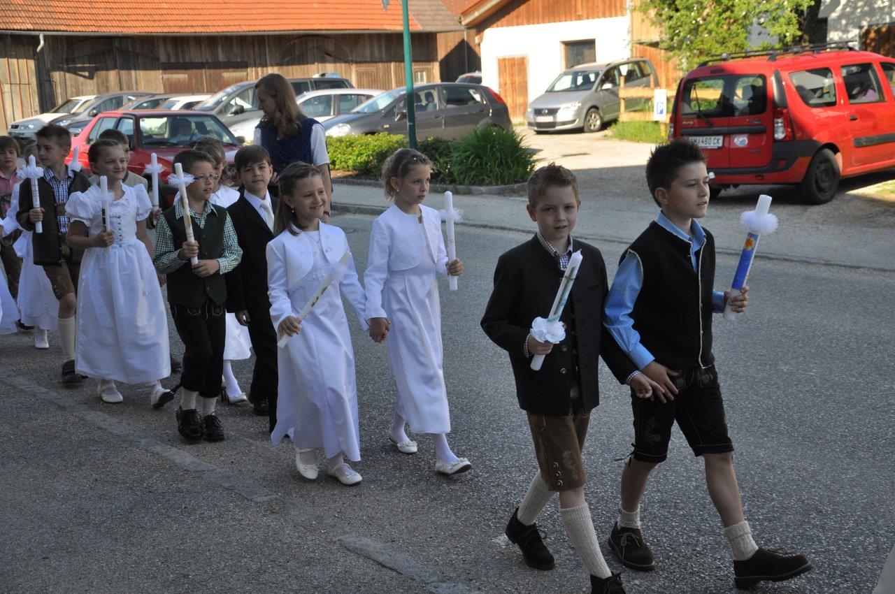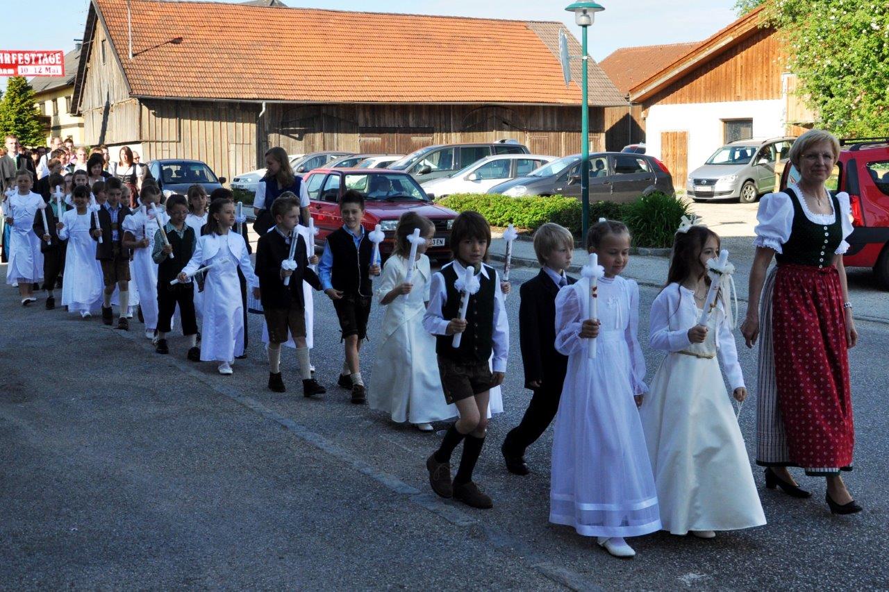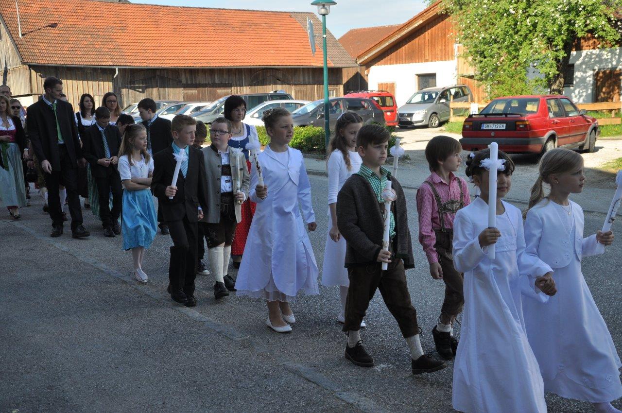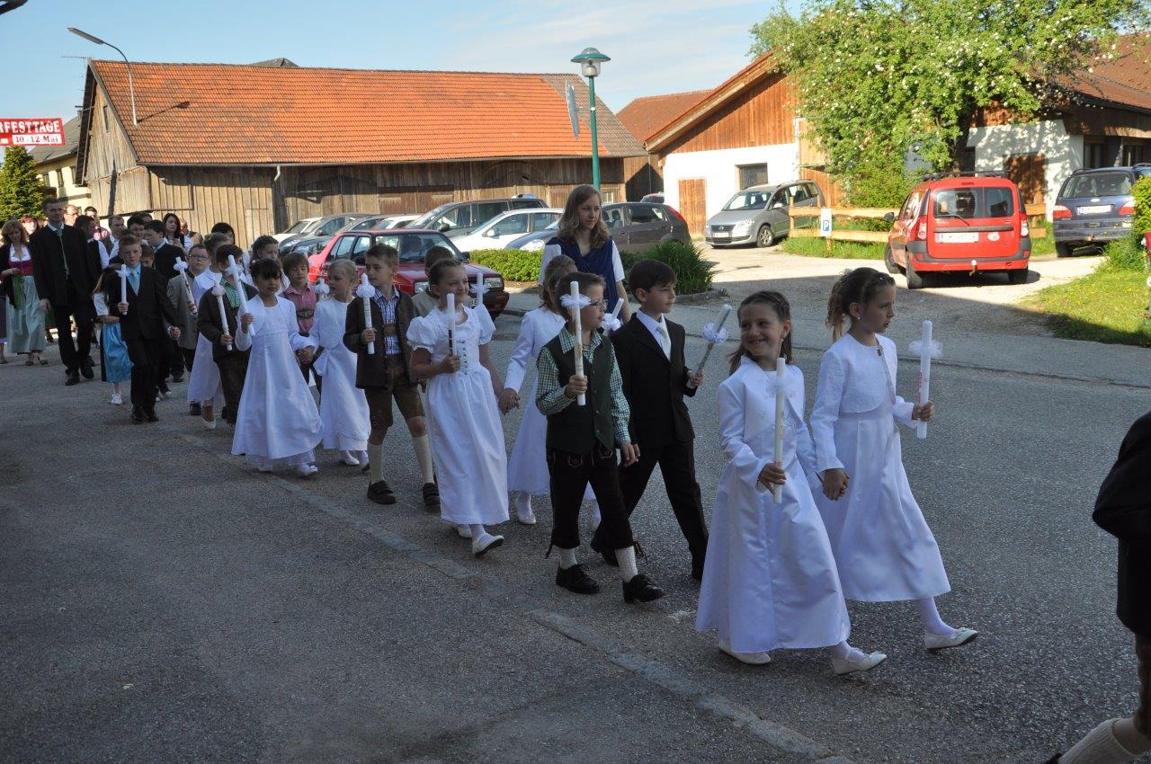 Den Abschluss dieses wunderschönen Tages bildete die abendliche Prozession und Maiandacht, angeführt von der Musikkapelle, zur Leitinger Kapelle. Hier wurde nach der Segnung jedes einzelnen Kindes das Pfarrgeschenk, ein von der Firma SFK Spitzbart hergestelltes Kreuz, übergeben.