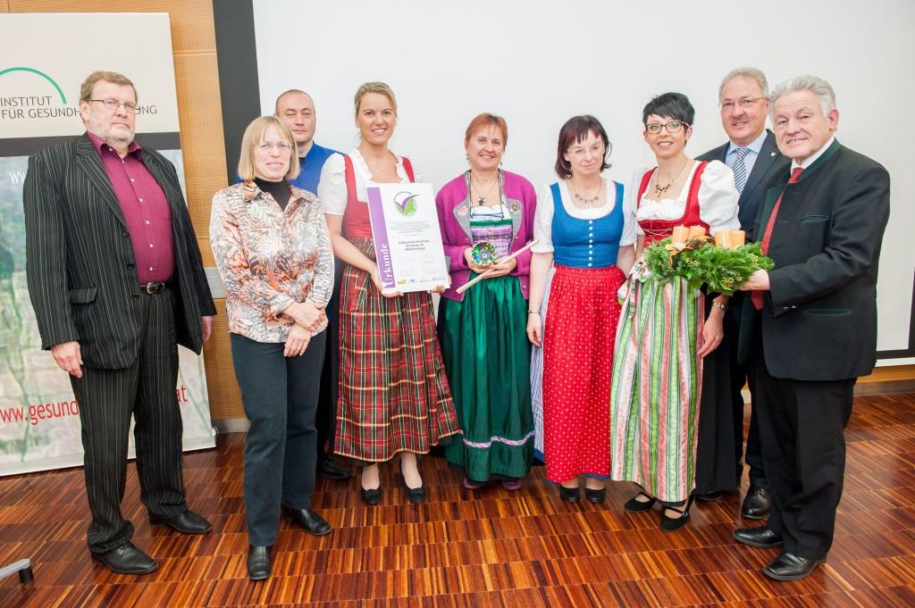 ![]() Foto (Land OÖ): Das Team der Kirchhamer Volksschule bei der Verleihung des Gütesiegels „Gesunde Gemeinde“ mit den Ehrengästen v.r.n.l.: LH Dr. Josef Pühringer, Bürgermeister Hans Kronberger, Elternvereinsobfrau Verena Freilinger, VS-Pädagogin Monika Steiner, Schulrätin Cilli Peyer, Direktorin Karin Schwarzlmüller, Mag. Markus Peböck, Landesschulärztin Dr. Gertrude Jilich und OÖ-GKK-Obmann Felix Hinterwirth. |