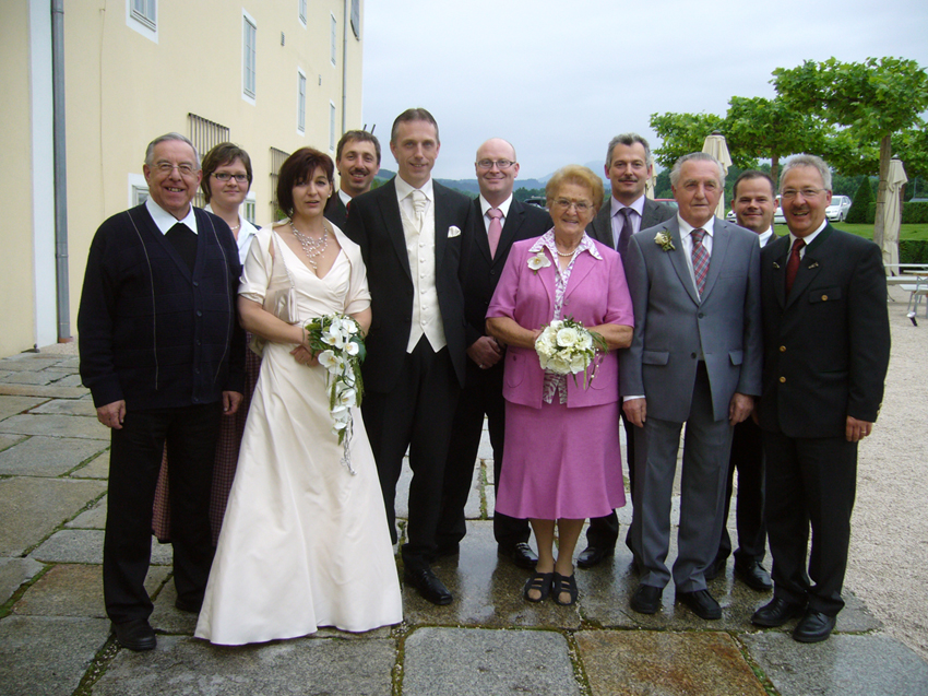 Ein besonderes, vor allem seltenes Ereignis durfte die bekannte Gastwirtsfamilie Bauer am vergangenen Samstag gemeinsam mit der Kirchhamer Dorfgemeinschaft begehen. Die Seniorchefs Ludwig und Cäcilia Bauer begingen ihr 50jähriges Ehejubiläum und feierten Goldhochzeit. Gleichzeitig gaben sich Sohn Franz (39) und seine Gabi, die den traditionellen Gastbetrieb seit einige Jahren sehr erfolgreich führen, das Ja-Wort für den gemeinsamen Lebensweg. Der von Pfarrer Kons. Rat P. Burkhard Berger festlich zelebrierte Gottesdienst wurde von der Musikkapelle Kirchham feierlich gestaltet. Das Festmahl, zu dem sich die gesamt Ortsprominenz einfand, wurde in den Räumlichkeiten der Schlossbrauerei Eggenberg abgehalten. Bürgermeister Hans Kronberger erwähnte die Bedeutung der beliebten Gastwirtsfamilie für die Laudachtalgemeinde („…der Bauer-Wirt ist ja viel mehr als bloß ein sehr gutes Gasthaus, nämlich auch Kommunikationszentrum und Aussprache-Zimmer für alle möglichen Themen….“) und dankte im Namen aller Körperschaften und Vereine für die großartige Gastfreundschaft, welche die „Bauer-Familie“ seit 1963 der gesamten Dorfgemeinschaft und darüber hinaus vielen Gästen aus Nah und Fern, immer wieder bietet. Foto:Das Jubelpaar Ludwig und Cilli Bauer sowie das Brautpaar Franz und Gabi Bauer mit Pfarrer P. Burkhard Berger, Bürgermeister Hans Kronberger, Vizebgm. Anton Pühringer und den Gemeindevorständen Gabi und Gerhard Spitzbart, Andreas Mizelli und Günter Hartleitner.